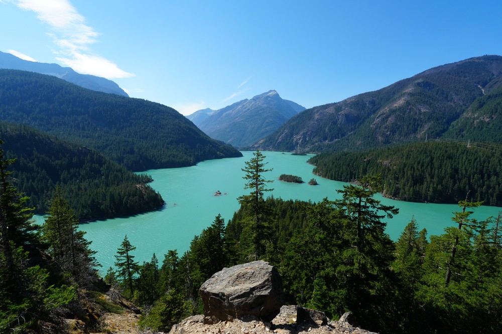 The vivid aqua colored lakes are iconic scenes that welcome me entering North Cascade National Park. This color is also called turquoise or cyan and the color is truly vibrant in the lakes. It is hard to imagine that a lake can have so different color from one another. The photo is taken at the Diablo Lake Vista Point, which is accessible by car. From the campground north of the SR20 at Diablo I also hiked the Thunder Knob Trail to a vista point to view the lake from a different angle.